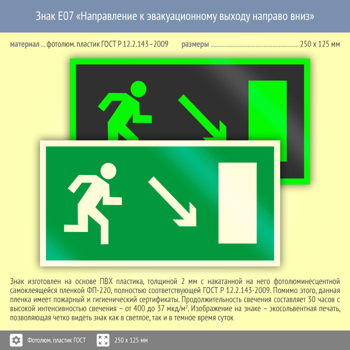 Знак E07 «Направление к эвакуационному выходу направо вниз» (фотолюминесцентный пластик ГОСТ 34428-2018, 250х125 мм) в Ижевске купить