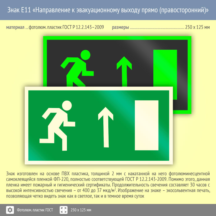 Знак E11 «Направление к эвакуационному выходу прямо (правосторонний)» (фотолюминесцентный пластик ГОСТ 34428-2018, 250х125 мм) в Ижевске купить