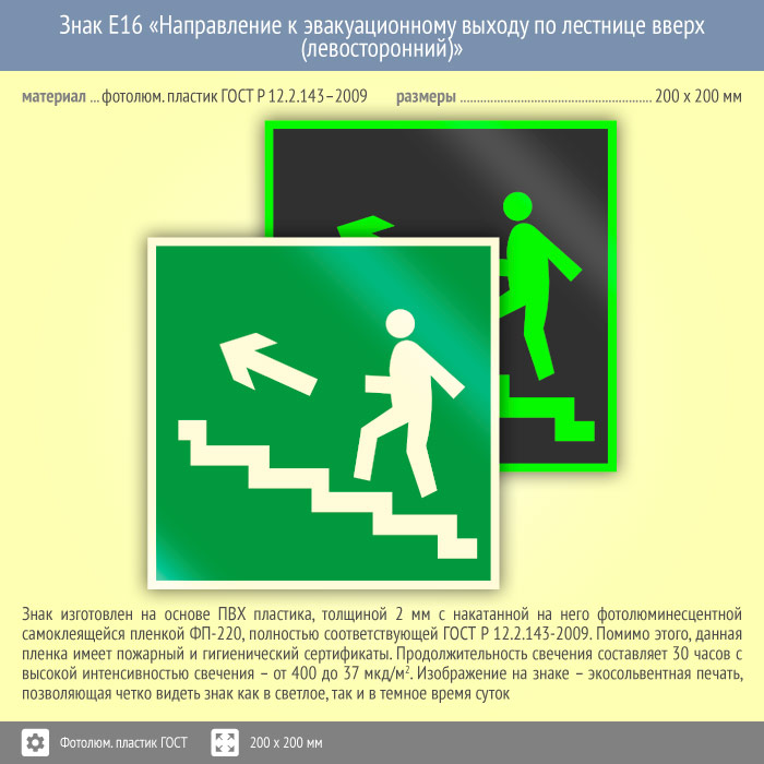 Знак E16 «Направление к эвакуационному выходу по лестнице вверх (левосторонний)» (фотолюминесцентный пластик ГОСТ 34428-2018, 200х200 мм) в Ижевске купить