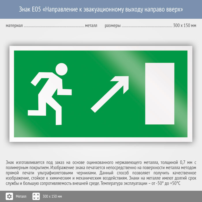 Знак E05 «Направление к эвакуационному выходу направо вверх» (металл, 300х150 мм) в Ижевске купить