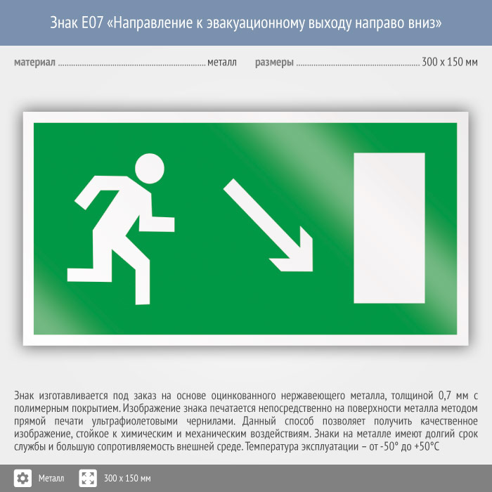 Знак E07 «Направление к эвакуационному выходу направо вниз» (металл, 300х150 мм) в Ижевске купить