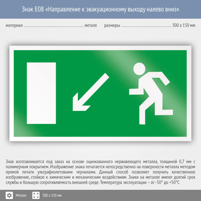 Знак E08 «Направление к эвакуационному выходу налево вниз» (металл, 300х150 мм) в Ижевске купить