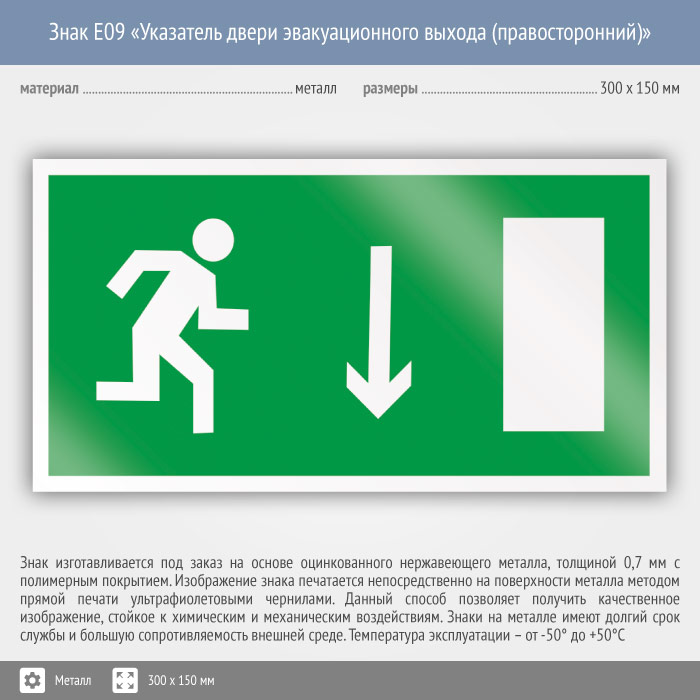 Знак E09 «Указатель двери эвакуационного выхода (правосторонний)» (металл, 300х150 мм) в Ижевске купить
