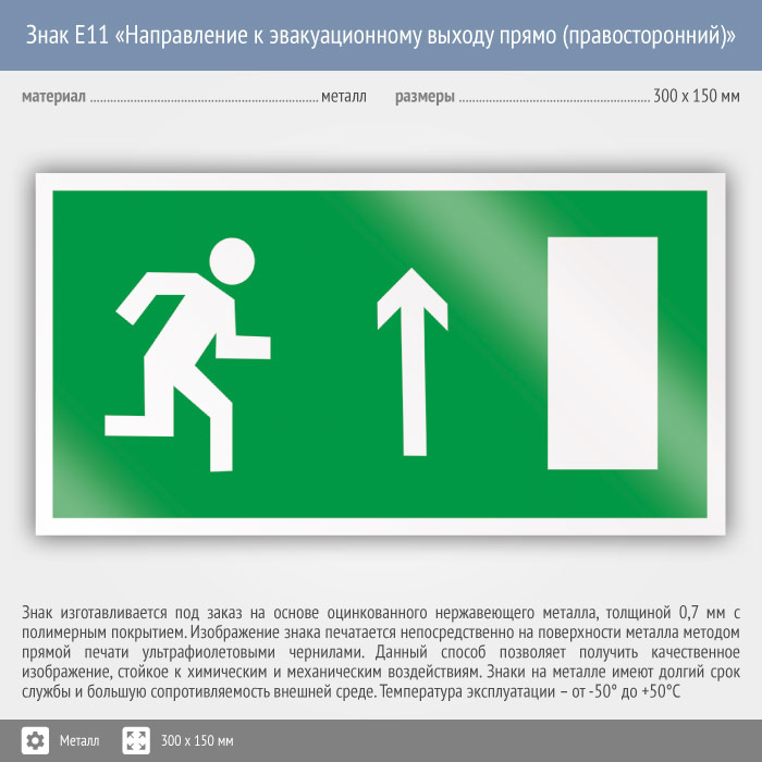Знак E11 «Направление к эвакуационному выходу прямо (правосторонний)» (металл, 300х150 мм) в Ижевске купить