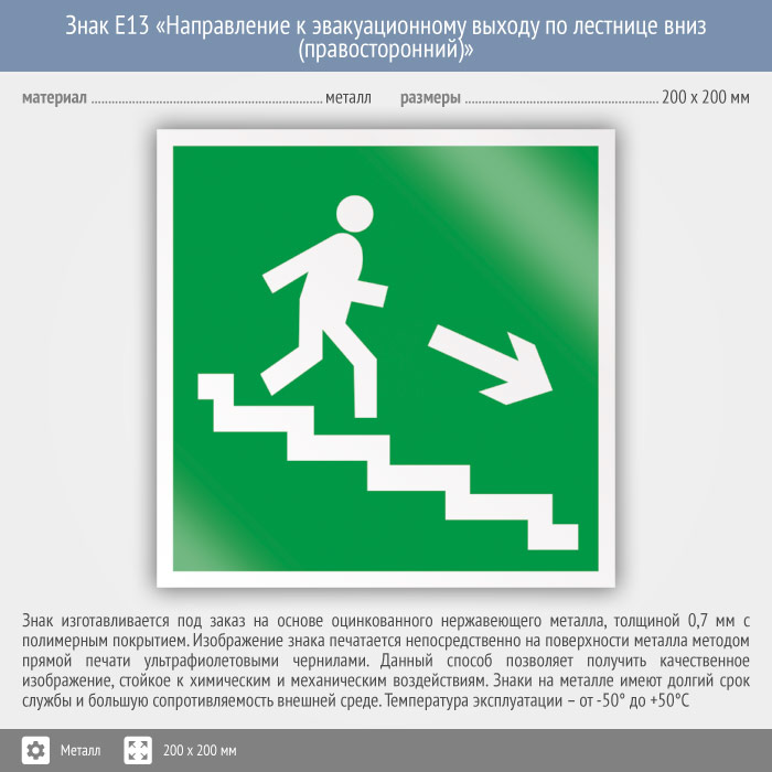 Знак E13 «Направление к эвакуационному выходу по лестнице вниз (правосторонний)» (металл, 200х200 мм) в Ижевске купить