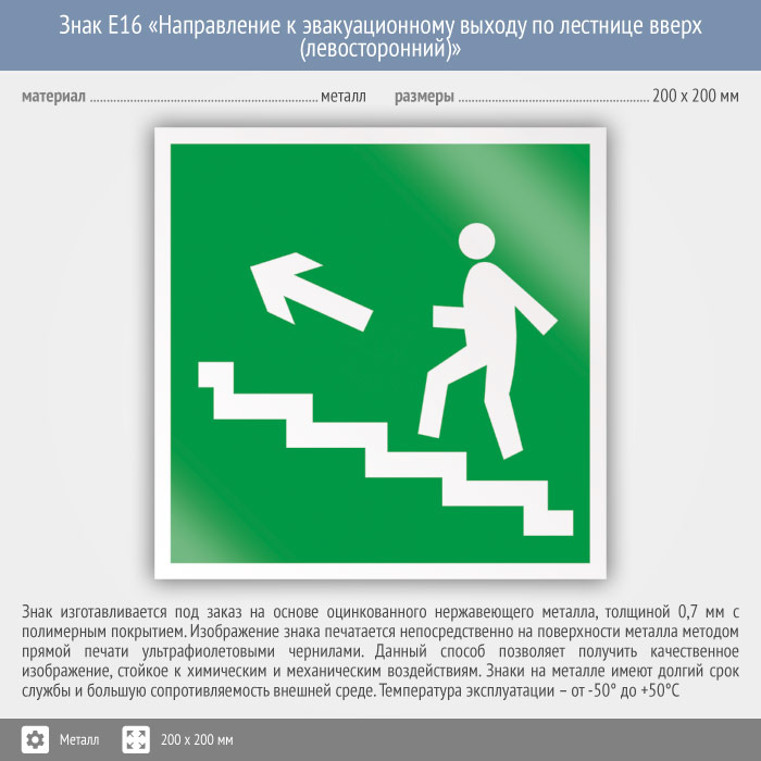 Знак E16 «Направление к эвакуационному выходу по лестнице вверх (левосторонний)» (металл, 200х200 мм) в Ижевске купить