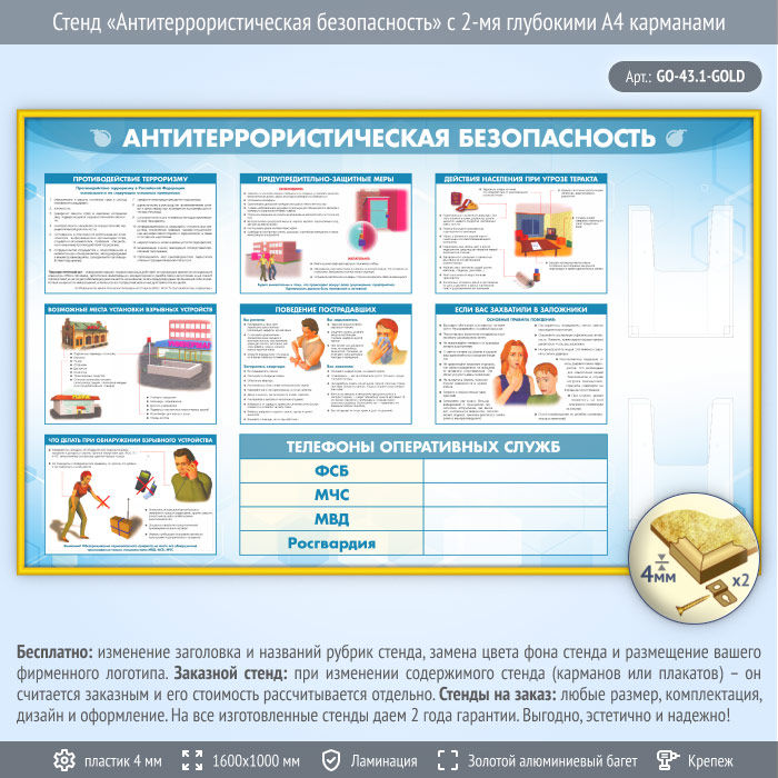 Стенд «Антитеррористическая безопасность» с 2-мя глубокими А4 карманами (GO-43.1-GOLD) в Ижевске купить
