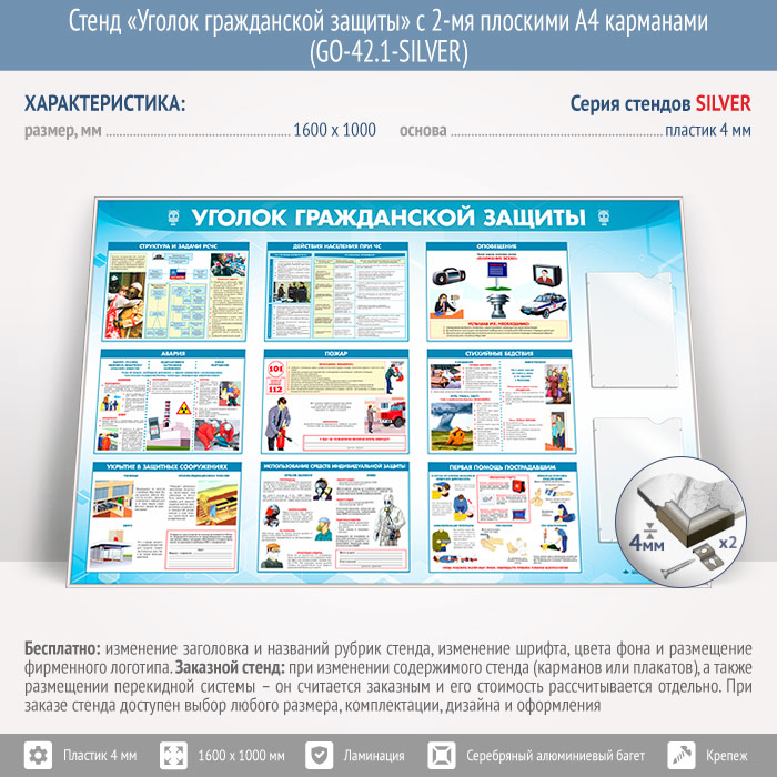 Стенд «Уголок гражданской защиты» с 2-мя плоскими А4 карманами (GO-42.1-SILVER) в Ижевске купить