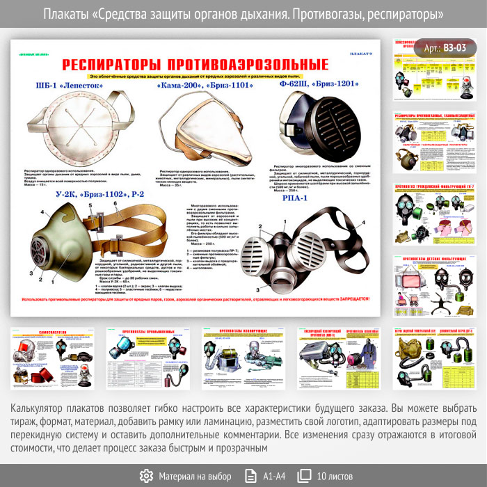 Плакаты «Средства защиты органов дыхания. Противогазы, респираторы» (ВЗ-03, 10 листов) в Ижевске купить