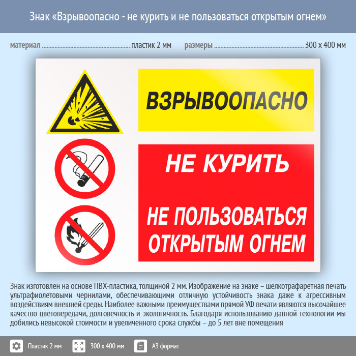 Знак «Взрывоопасно - не курить и не пользоваться открытым огнем», КЗ-09 (пластик, 400х300 мм) в Ижевске купить