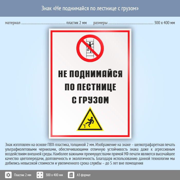 Знак «Не поднимайся по лестнице с грузом», КЗ-28 (пластик, 300х400 мм) в Ижевске купить