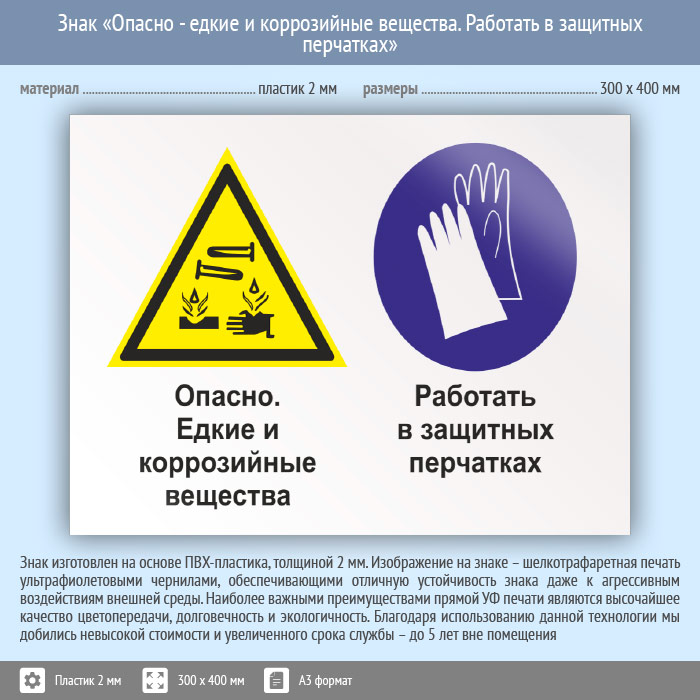 Знак «Опасно - едкие и коррозийные вещества. Работать в защитных перчатках», КЗ-36 (пластик, 400х300 мм) в Ижевске купить