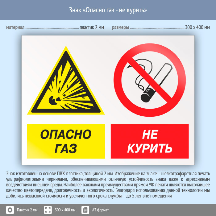 Знак «Опасно газ - не курить», КЗ-44 (пластик, 400х300 мм) в Ижевске купить
