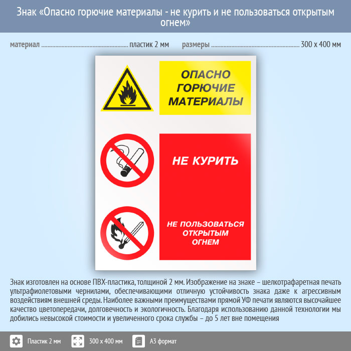 Знак «Опасно горючие материалы - не курить и не пользоваться открытым огнем», КЗ-45 (пластик, 300х400 мм) в Ижевске купить