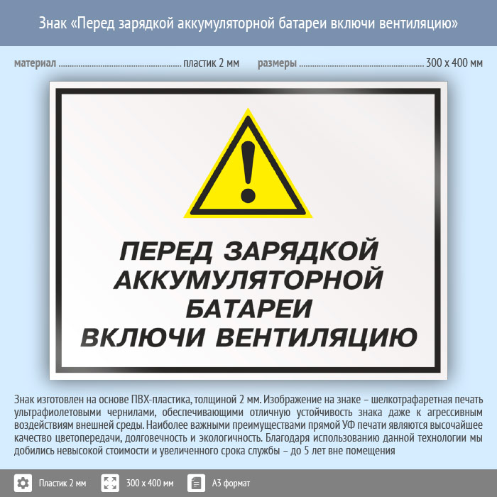 Знак «Перед зарядкой аккумуляторной батареи включи вентиляцию», КЗ-63 (пластик, 400х300 мм) в Ижевске купить