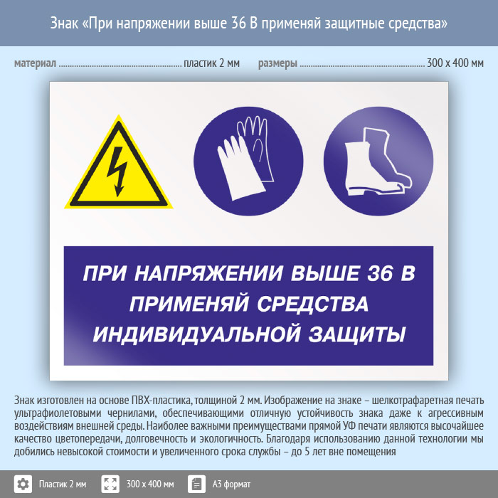 Знак «При напряжении выше 36 В применяй защитные средства», КЗ-71 (пластик, 400х300 мм) в Ижевске купить