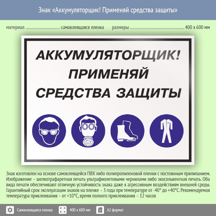 Знак «Аккумуляторщик! Применяй средства защиты», КЗ-02 (пленка, 600х400 мм) в Ижевске купить