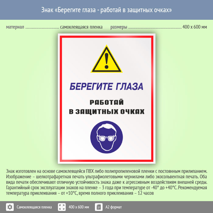 Знак «Берегите глаза - работай в защитных очках», КЗ-04 (пленка, 400х600 мм) в Ижевске купить