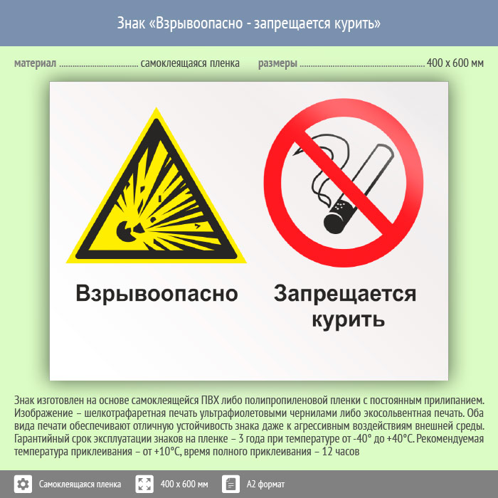 Знак «Взрывоопасно - запрещается курить», КЗ-06 (пленка, 600х400 мм) в Ижевске купить