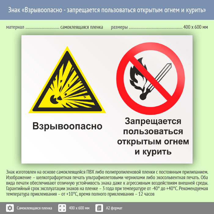 Знак «Взрывоопасно - запрещается пользоваться открытым огнем и курить», КЗ-07 (пленка, 600х400 мм) в Ижевске купить