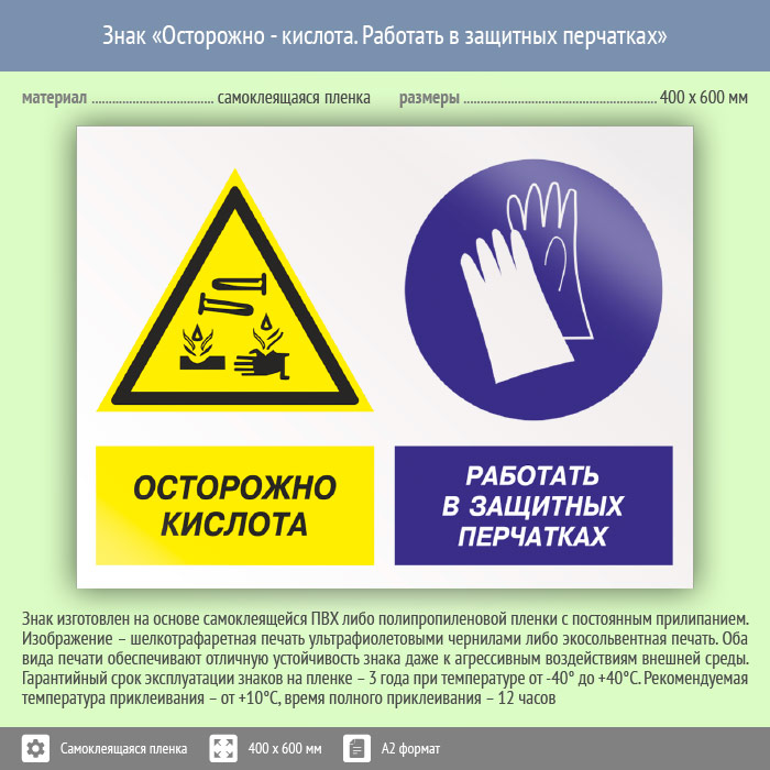 Знак «Осторожно - кислота. Работать в защитных перчатках», КЗ-56 (пленка, 600х400 мм) в Ижевске купить