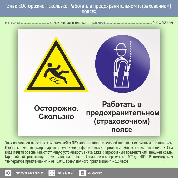 Знак «Осторожно - скользко. Работать в предохранительном (страховочном) поясе», КЗ-58 (пленка, 600х400 мм) в Ижевске купить