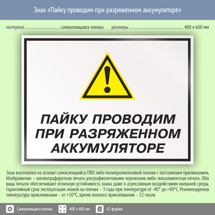 Знак «Пайку проводим при разряженном аккумуляторе», КЗ-62 (пленка, 600х400 мм) в Ижевске купить
