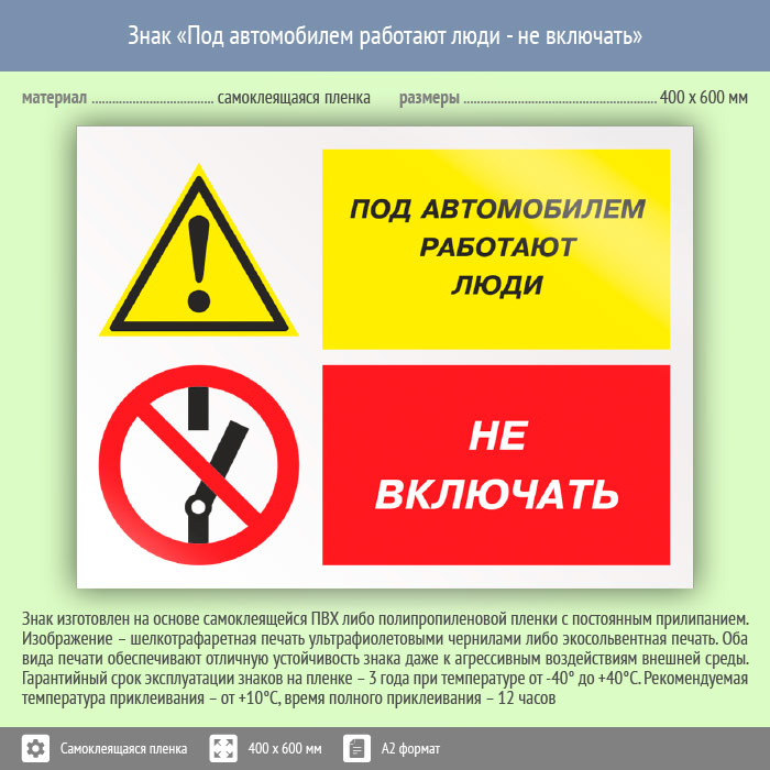Знак «Под автомобилем работают люди - не включать», КЗ-65 (пленка, 600х400 мм) в Ижевске купить