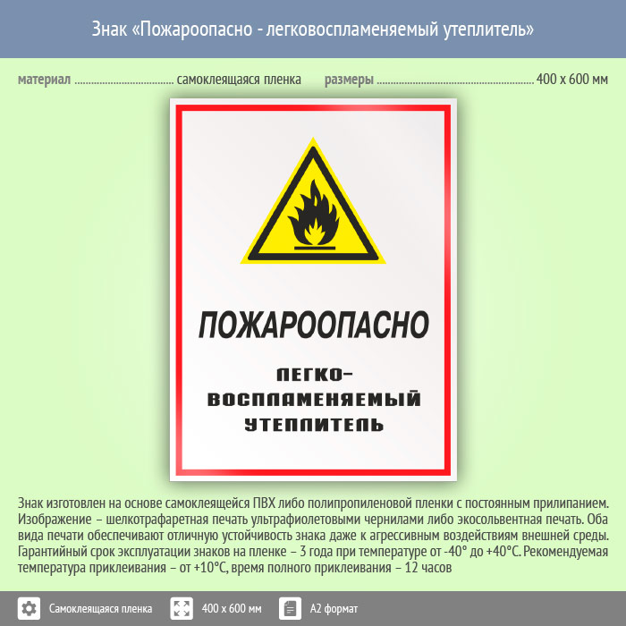 Знак «Пожароопасно - легковоспламеняемый утеплитель», КЗ-68 (пленка, 400х600 мм) в Ижевске купить