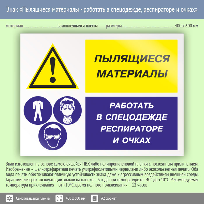 Знак «Пылящиеся материалы - работать в спецодежде, респираторе и очках», КЗ-79 (пленка, 600х400 мм) в Ижевске купить