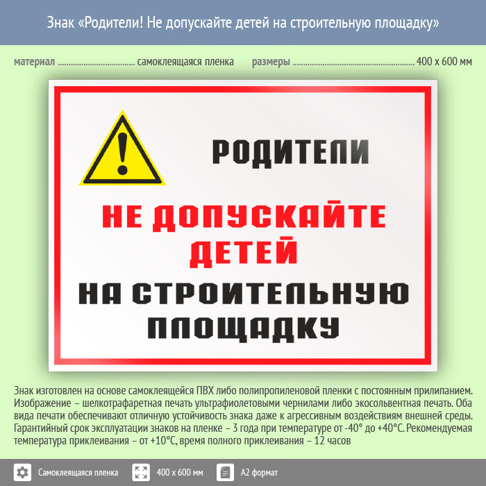 Знак «Родители! Не допускайте детей на строительную площадку», КЗ-84 (пленка, 600х400 мм) в Ижевске купить
