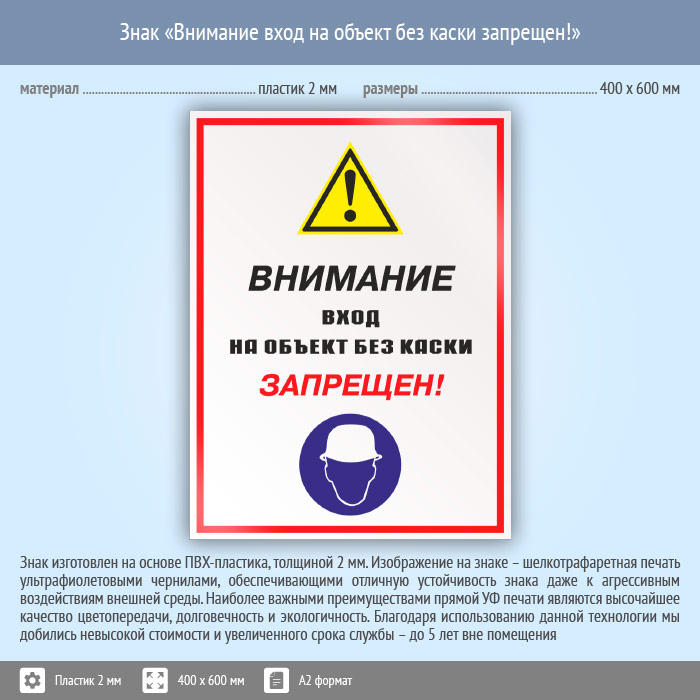 Знак «Внимание вход на объект без каски запрещен!», КЗ-13 (пластик, 400х600 мм) в Ижевске купить
