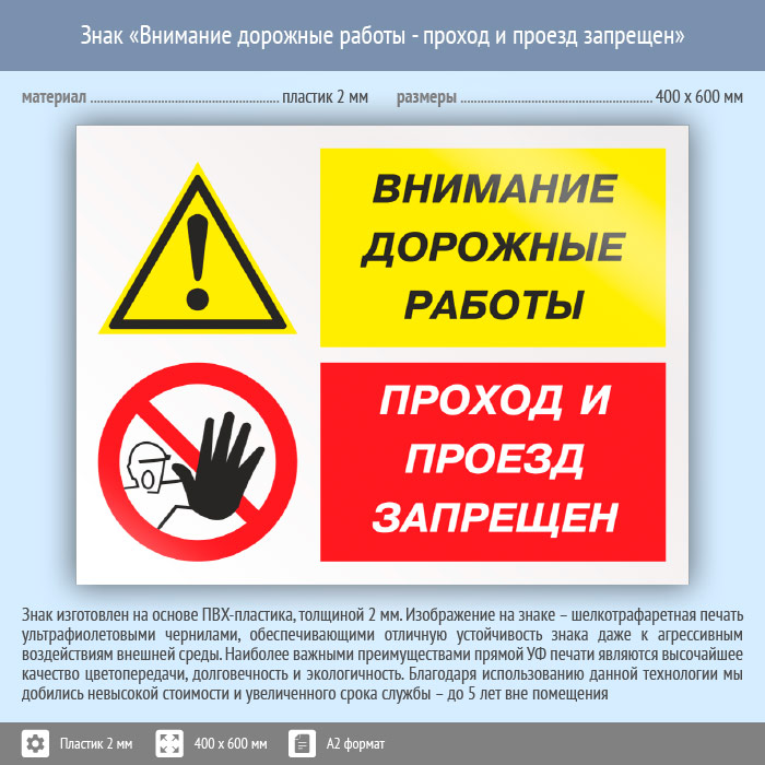 Знак «Внимание дорожные работы - проход и проезд запрещен», КЗ-14 (пластик, 600х400 мм) в Ижевске купить