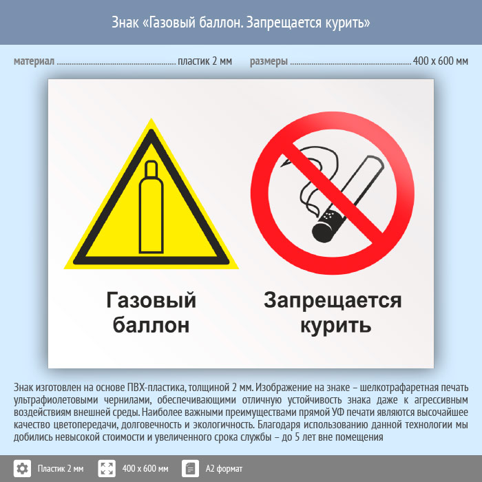 Знак «Газовый баллон. Запрещается курить», КЗ-18 (пластик, 600х400 мм) в Ижевске купить