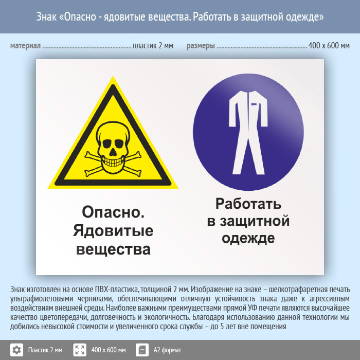 Знак «Опасно - ядовитые вещества. Работать в защитной одежде», КЗ-42 (пластик, 600х400 мм) в Ижевске купить