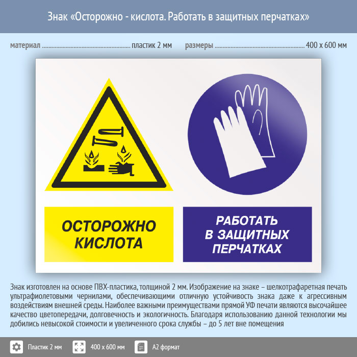 Знак «Осторожно - кислота. Работать в защитных перчатках», КЗ-56 (пластик, 600х400 мм) в Ижевске купить