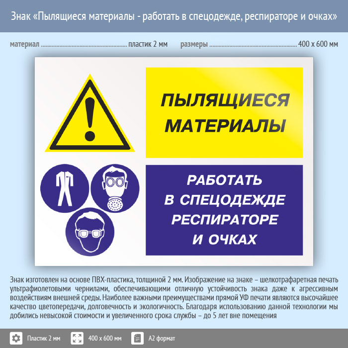 Знак «Пылящиеся материалы - работать в спецодежде, респираторе и очках», КЗ-79 (пластик, 600х400 мм) в Ижевске купить