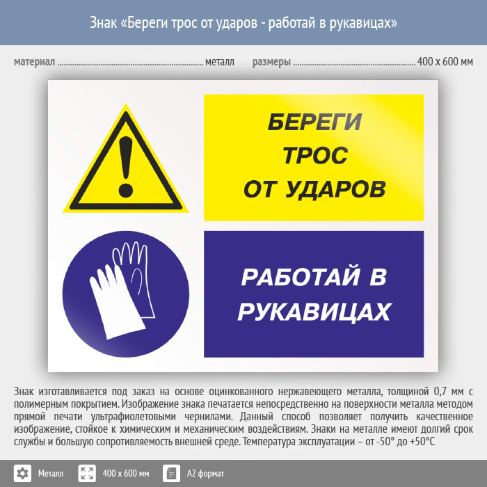 Знак «Береги трос от ударов - работай в рукавицах», КЗ-03 (металл, 600х400 мм) в Ижевске купить