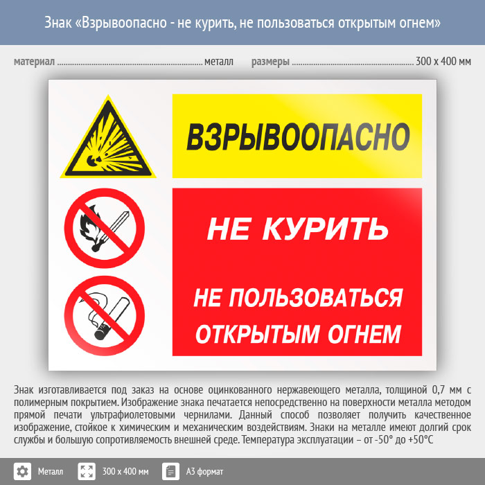 Знак «Взрывоопасно - не курить, не пользоваться открытым огнем», КЗ-05 (металл, 400х300 мм) в Ижевске купить