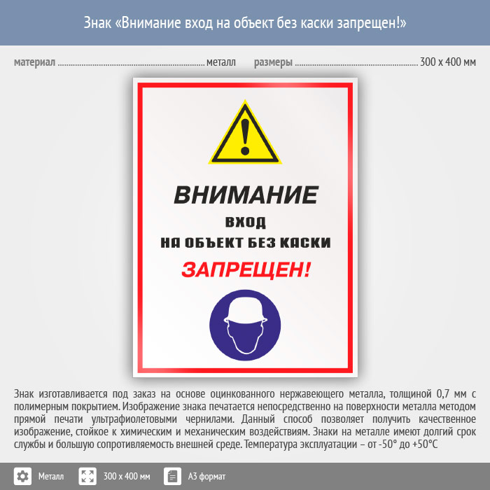 Знак «Внимание вход на объект без каски запрещен!», КЗ-13 (металл, 300х400 мм) в Ижевске купить