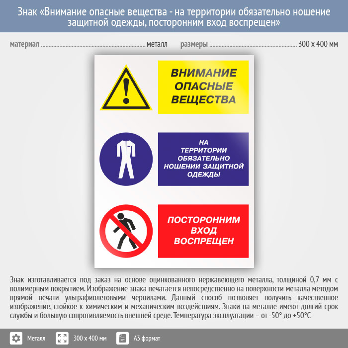 Знак «Внимание опасные вещества - на территории обязательно ношение защитной одежды, посторонним вход воспрещен», КЗ-15 (металл, 300х400 мм) в Ижевске купить
