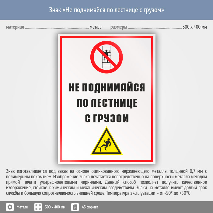 Знак «Не поднимайся по лестнице с грузом», КЗ-28 (металл, 300х400 мм) в Ижевске купить