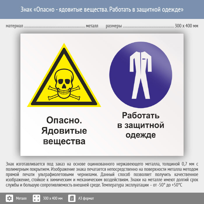 Знак «Опасно - ядовитые вещества. Работать в защитной одежде», КЗ-42 (металл, 400х300 мм) в Ижевске купить