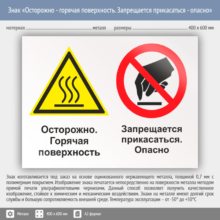 Знак «Осторожно - горячая поверхность. Запрещается прикасаться - опасно», КЗ-54 (металл, 600х400 мм) в Ижевске купить
