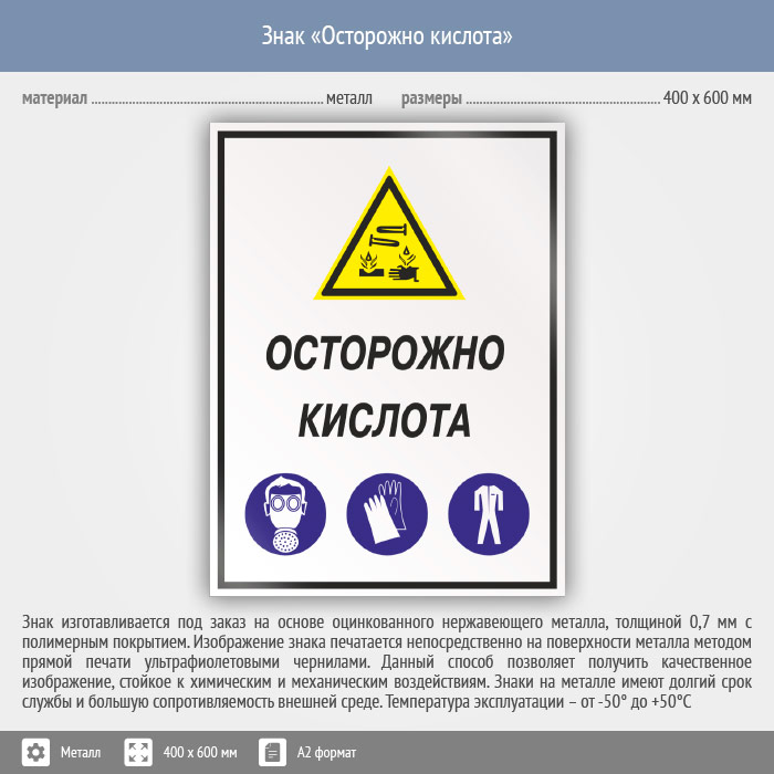 Знак «Осторожно кислота», КЗ-61 (металл, 400х600 мм) в Ижевске купить