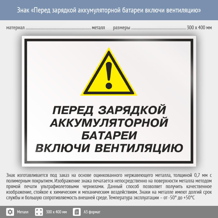 Знак «Перед зарядкой аккумуляторной батареи включи вентиляцию», КЗ-63 (металл, 400х300 мм) в Ижевске купить