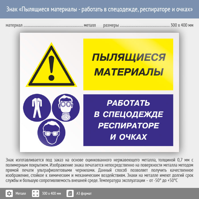 Знак «Пылящиеся материалы - работать в спецодежде, респираторе и очках», КЗ-79 (металл, 400х300 мм) в Ижевске купить