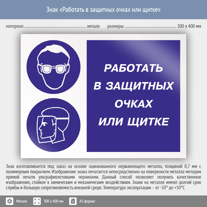 Знак «Работать в защитных очках или щитке», КЗ-80 (металл, 400х300 мм) в Ижевске купить