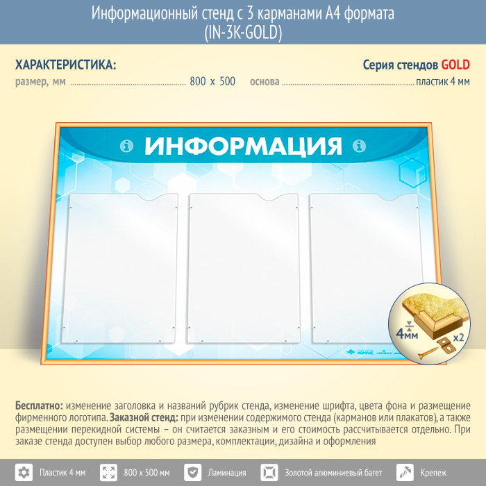 Информационный стенд с 3 карманами А4 формата (IN-3K-GOLD) в Ижевске купить