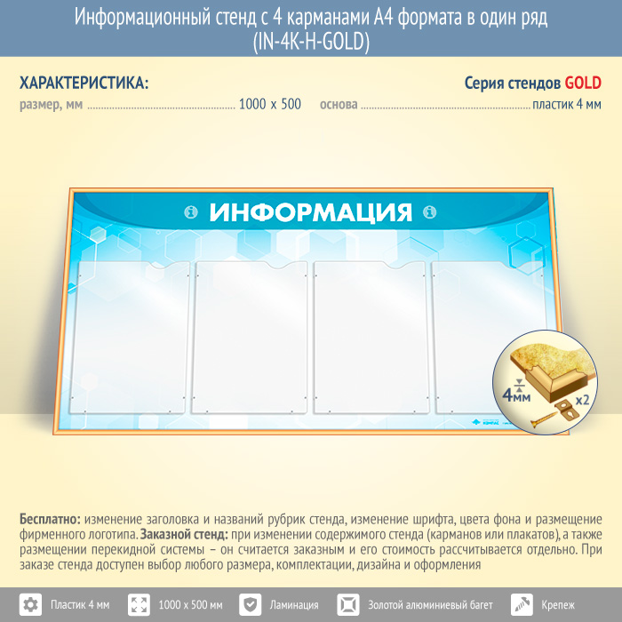 Информационный стенд с 4 карманами А4 формата в один ряд (IN-4K-H-GOLD) в Ижевске купить